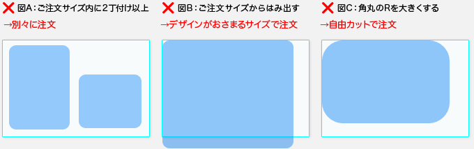 - 図C:角丸のRを大きくして作成したい場合・・・自由カットにて承ります。