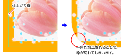 仕上がりサイズの3mm以上内側でも、角の文字が切れてしまう場合がありますので、とくにご注意ください。