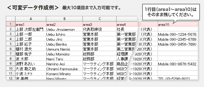 可変データ項目は10項目(area1~area10)までです。