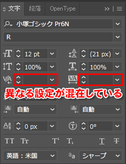 (設定が混在している場合は、文字パレットで項目の欄が空白で表示されます。)
