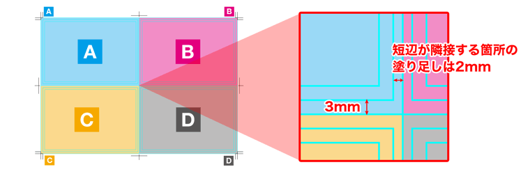塗り足しは、長辺(3mm)と短辺(2mm)で各辺幅が異なります。テンプレートに沿って塗り足しを作成してください。