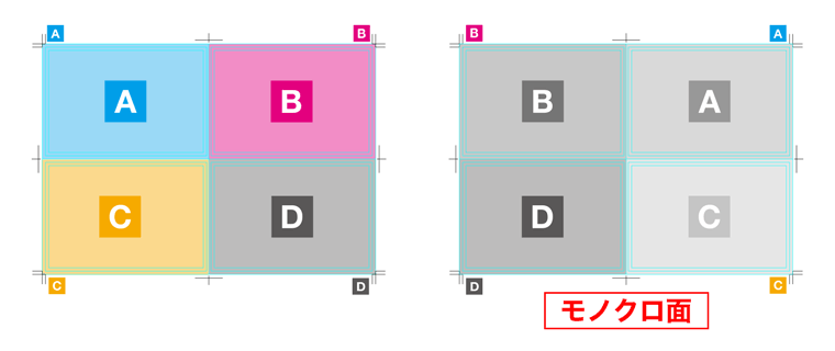 Illustratorでデータ作成された場合は、モノクロ面の指示をトリムマークよりも外側に記載し指示することが可能です。