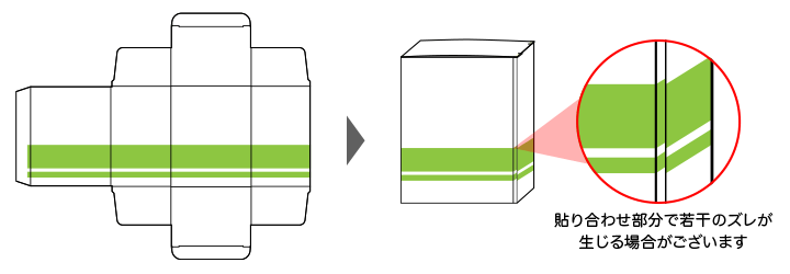 【重なった部分の塗り足し】 フタ部分とフラップ部分のデザイン(色や柄)が異なる場合は、フラップ側にフタの塗り足しを作成してください。その際、斜めに逃げの処理をしてください。
