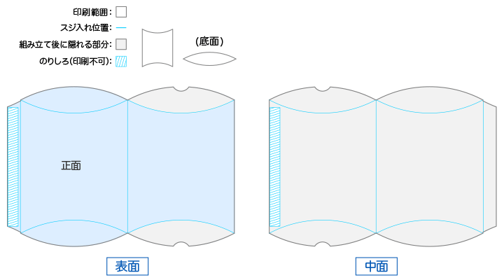 ピロー型の展開図については、図のとおりです。のりしろ部分以外のエリアについて、デザインすることが可能です。