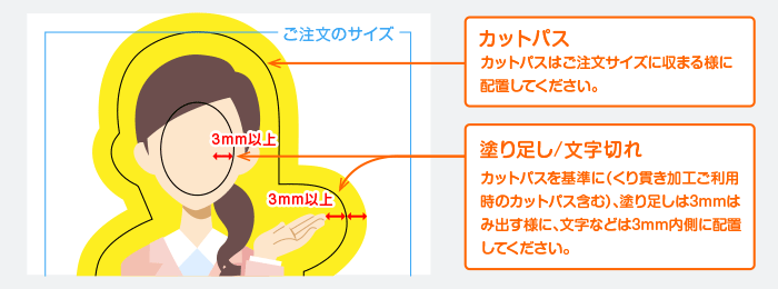【塗り足し/文字切れについて】 背景色は、カットパス(くり貫き加工利用時のカットパス含む)よりも3mm以上大きくつけてください。また、重要な文字や画像はカットパスより3mm内側に配置してください。