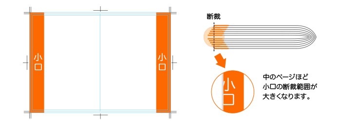 冊子の特性上、ページ数が多い場合や、本文用紙が厚めの場合に、小口側の断裁範囲が中のページ程大きくなります(下図参照)。通常の塗り足し範囲(3mm)以上に断裁されますので、データ作成の際、小口のアキにご注意ください。