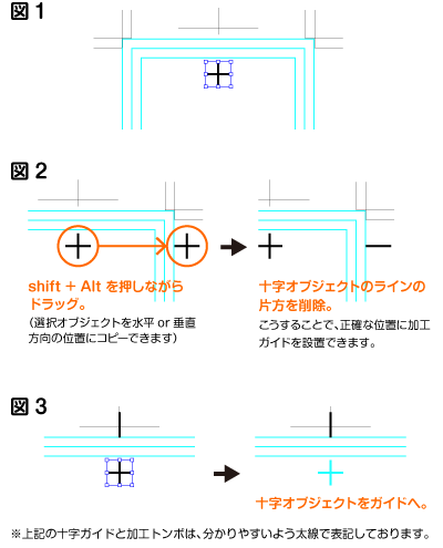 十字オブジェクトをガイドにします。(図3)
