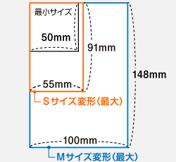 Sサイズ変型(最小50mm×50mm~最大55mm×91mm)とMサイズ変型(~最大100mm×148mm)の間で用途に合ったサイズで作成してください。