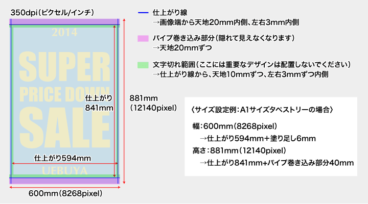 上図は、A1サイズのタペストリーを作成する際のサイズの例です。解像度は350dpiで作成しております。