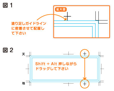 始点の十字オブジェクトの垂直方向下に終点(塗り足しガイドに密着)の十字オブジェクトを配置します(図2)