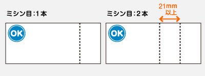 ミシン目の加工は長い辺に対し垂直且つ、直線にのみ承っております。また、ミシン目加工位置は、 断裁位置から21mm以上離して配置してください。ミシン目を2本入れる場合は、右の図の通りミシン目の間を21mm以上離してください。