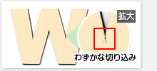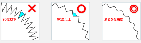 カットパスの形状が、90度よりも狭い鋭角なラインの場合、わずかな切り込みが入ってしまいます。
