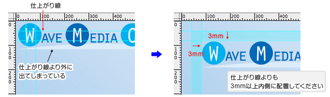 仕上がり線より外(または仕上がり線ギリギリの位置)に配置されている文字は、仕上がり線よりも3mm以上内側に移動させてください。