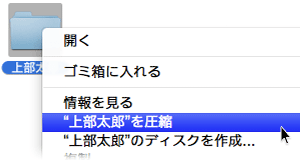 必要なデータをまとめたフォルダを右クリック(「control」キーを押しながらクリック)し、「アーカイブを作成」若しくは「圧縮」を選択することでZIP圧縮ができます。