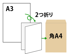 郵送時は、定形郵便(DM折りで長3封筒)、定形外郵便の規格内(二つ折りで角2/角A4封筒)が一般的です。折らずに送る場合は角A3封筒が必要で、この場合は定形外郵便の規格外となります。
