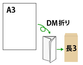 - 定形郵便:DM折り または 2つ折りクロスZ折り にして長3封筒で郵送可能。料金は重量で変動。(A3用紙1枚10グラム、長3封筒1通5グラムで換算した場合、2枚まで最低価格で郵送可能)