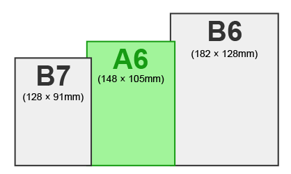 A6サイズに近いサイズとしては、一回り小さい B7サイズ(91mm × 128mm)、一回り大きい B6サイズ(128mm × 182mm)があります。