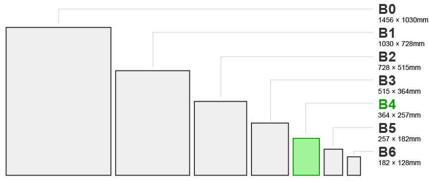 B4サイズは、257mm × 364mmです。B4サイズは新聞の折込チラシや、原稿用紙、賞状でよく利用されているサイズです。