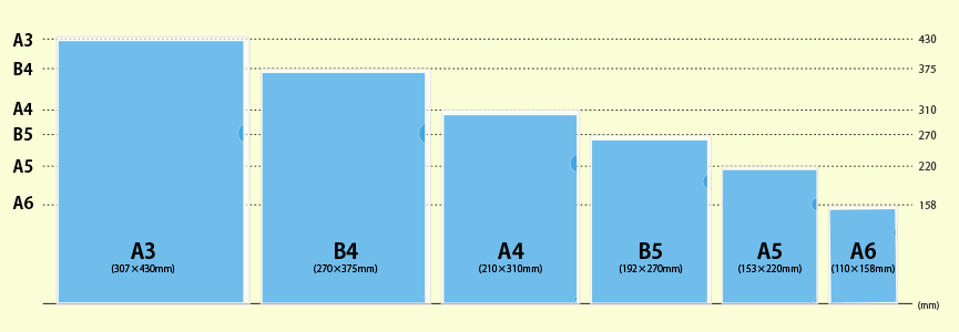 A判はドイツで提案された規格で、ISOによって国際規格として採用されています。一方、B判は日本の美濃紙を基に作られた日本独自の規格です。A判はA0を基準とし、数字が大きくなるにつれて面積が半分になる規則的なサイズ展開が特徴です。B判も同様にB0を基準とし、面積が半分になるようにサイズが変化します。A判/B判の詳細はこちら