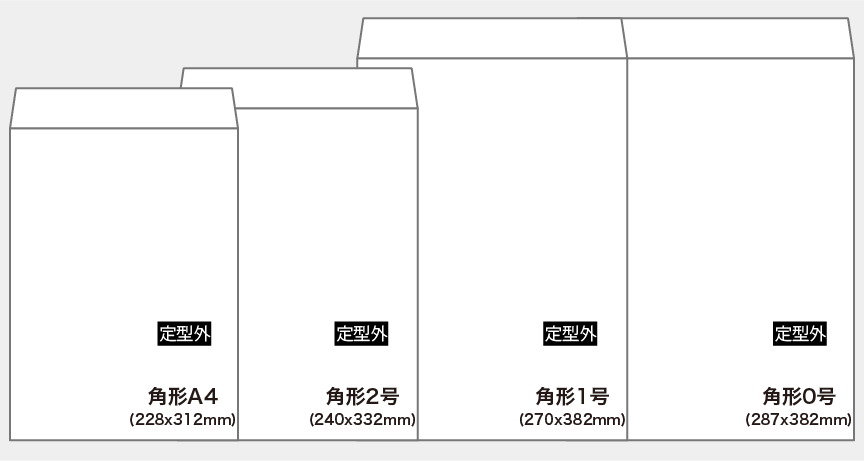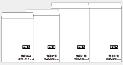 | 角形2号 | 240×332 | 定形外 | A4 A3長辺2つ折り A2 クロス8頁折り A1 MAP折り等 |