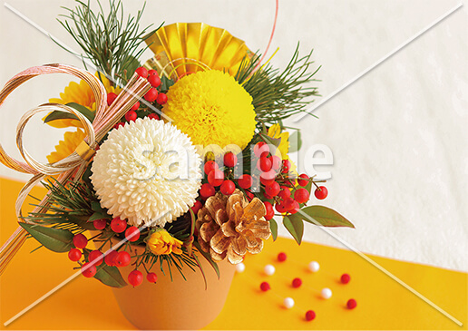 「菊を飾ると福が来る」といわれ、古来から邪気を払い長寿の効能があるとされる菊の花と、「難を転ずる」から縁起の良い木とされる南天を使ったお正月らしいアレンジメントです。