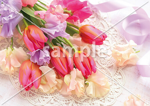 春らしいチューリップのブーケです。ピンクのチューリップの花言葉は「愛の芽生え」「誠実な愛」などがあります。チューリップは花びらの数や形、大きさなどの違いで数千の品種があります。