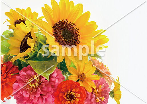 夏らしいビビッドカラーのアレンジメントです。ヒマワリには「憧れ」「あなただけを見つめる」、ジニアには「遠く離れた友を思う」「いつまでも変わらぬ心」などの花言葉があります。