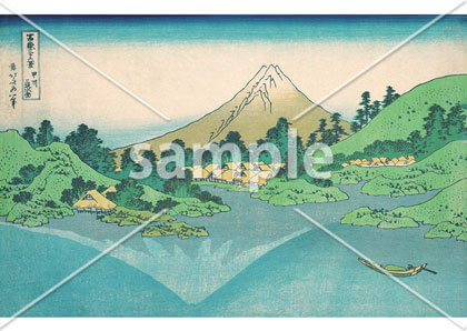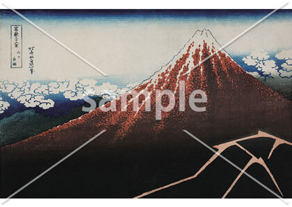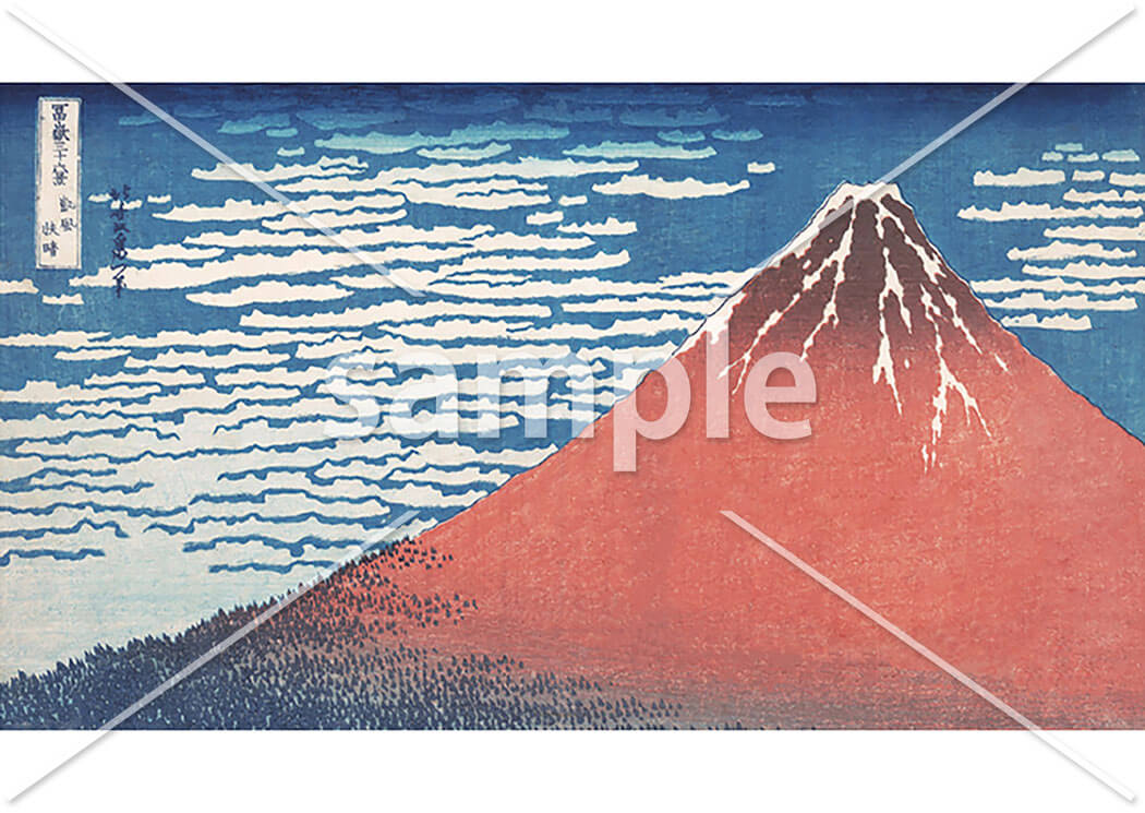 富嶽三十六景シリーズを代表する作品で「赤富士」とも呼ばれています。富士を大きく正面から描いた作品で、山の裾野には樹海、空にはいわし雲が描かれています。