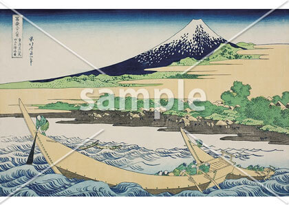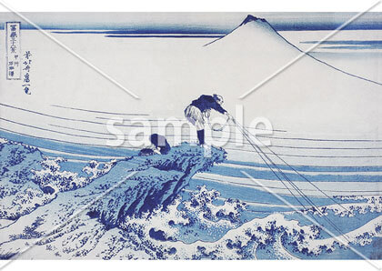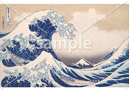 富嶽三十六景シリーズ中の傑作の一つ。波が押し寄せる瞬間を捉えたダイナミックさと奥に佇む富士山の静と動の構図で世界的に有名な作品です。