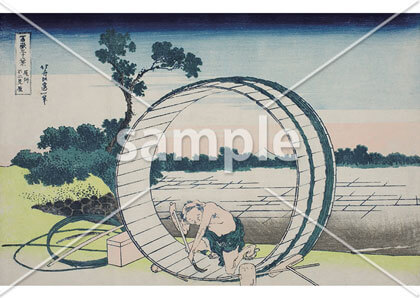 現在の愛知県名古屋市中区富士見町周辺を描いたものとされています。丸い桶の中に小さく富士が覗く面白い構図で有名な作品です。