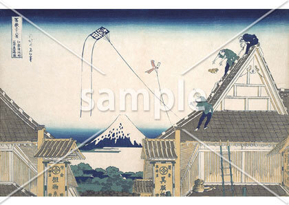 現在の日本橋室町である駿河町を描いた作品です。当時大繁盛していた越後屋三井呉服店(現在の日本橋三越百貨店)と、その屋根の上で働く職人の様子が生き生きと表現されています。