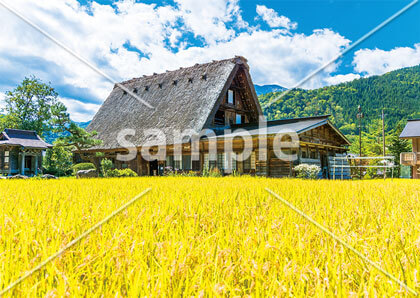 合掌造りで有名な白川郷の秋の風景です。黄金に輝く稲穂が由緒ある集落の秋をより色鮮やかに彩っています。