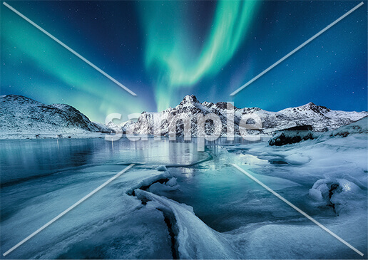 ノルウェー北西部にあるロフォーテン諸島は、オーロラが多く出現する北緯65~70度付近の「オーロラベルト」の直下に位置します。フィヨルドの地形に切り立つ山々とオーロラが織り成す大パノラマの絶景です。