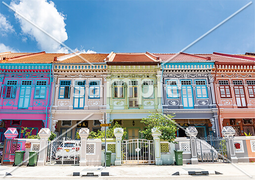 シンガポールで見られる「プラナカン建築」のショップハウス。中国やインドの東洋風のデザインと西洋建築を融合させた独自のスタイルが特徴で、明るいパステルカラーの華やかな外壁と美しい装飾がよく映えます。