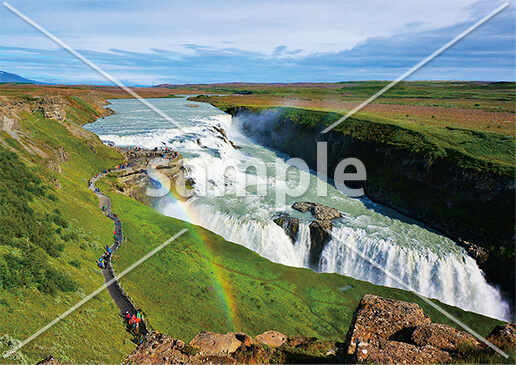 非常に多くの滝を有するアイスランド。その中でも南部にある「黄金の滝」を意味するグトルフォスは、国内最大級の氷河を水源とする大瀑布。常に水飛沫が舞っているので、晴れた日には虹がかかることがあります。