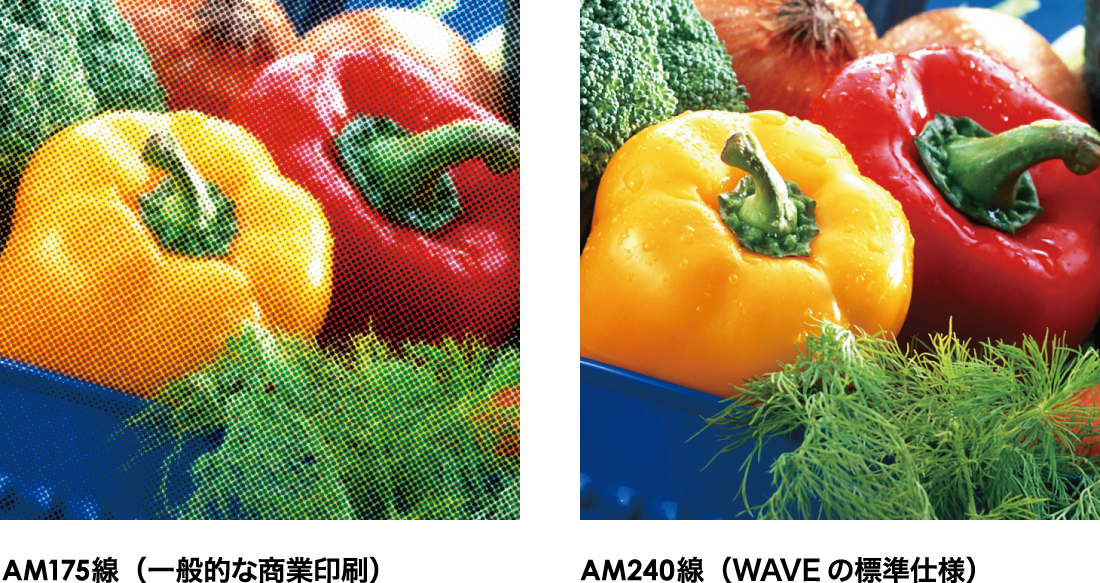 商業印刷物は"AMスクリーニング175線"での印刷が主流の中、弊社ではほぼ全てのオフセット印刷を一般的な商業印刷よりも高品質な『高精細オフセット印刷』にて仕上げています。高精細印刷では細部の表現力が向上し、色鮮やかで高品質な印刷物に仕上がります。