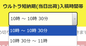 ウルトラ短納期の対応商品の料金表に、入稿時間帯の選択肢をご用意しています。選択された時間帯によって、料金が変動します。