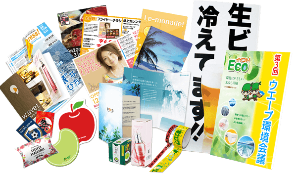 チラシや名刺、カタログ冊子、サインディスプレイ、オリジナルグッズまで。