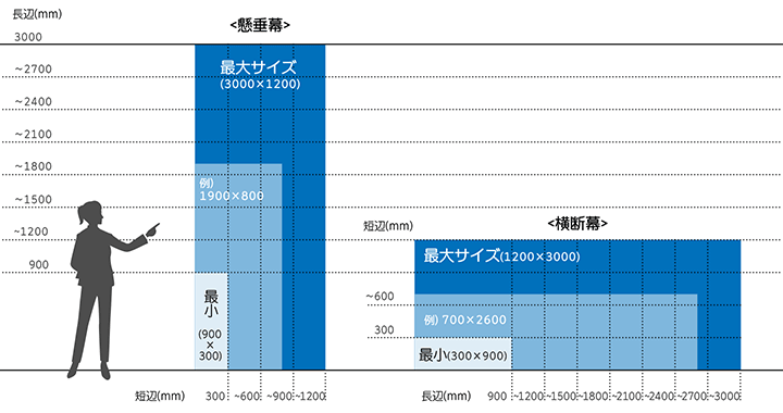 サイズは長辺が900mm~3000mm、短辺が300mm~1200mmまで。変型サイズにも対応しているため、正方形型の横断幕や懸垂幕も作成可能です。