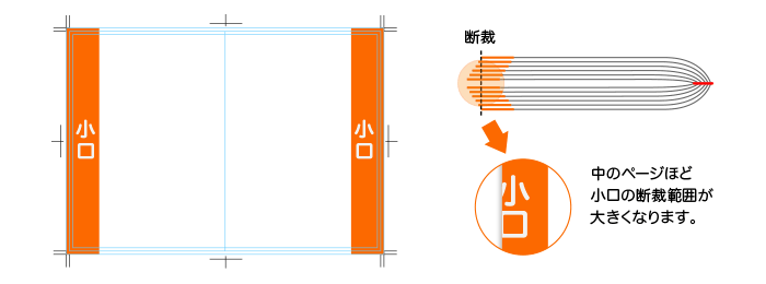 製造工程において、最後に上下と小口の三方を仕上げ断裁するため、中のページほど小口の断裁範囲が大きくなります。そのため、小冊子や比較的ページ数が少ない冊子に向いています。(弊社では8ページから96ページまで対応。ページ数は必ず4の倍数になります)