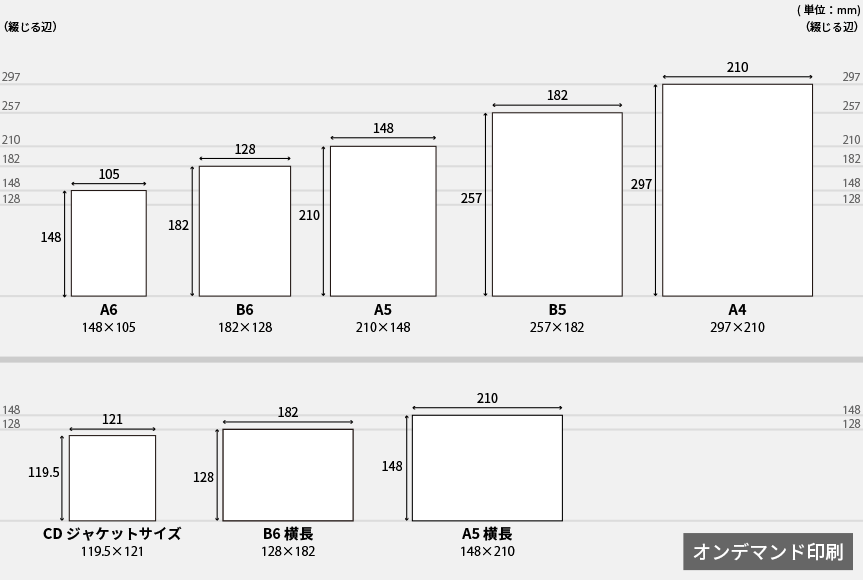 A6~A3、B7~B4、CDジャケットサイズのほか、変型サイズや横長サイズもご用意しています。