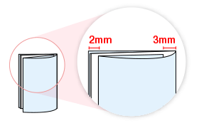 - 折り返した表紙は本文(中面)より少し短い仕上がりとなります(右図)。これは断裁の際に表紙部分を切り落とさないためですので、予めご了承ください。