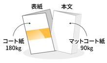 例えばマットコート紙90kgの本文にコート紙180kgの表紙といった組み合わせが可能です。(表紙は本文と同等以上の厚さである必要があります。)