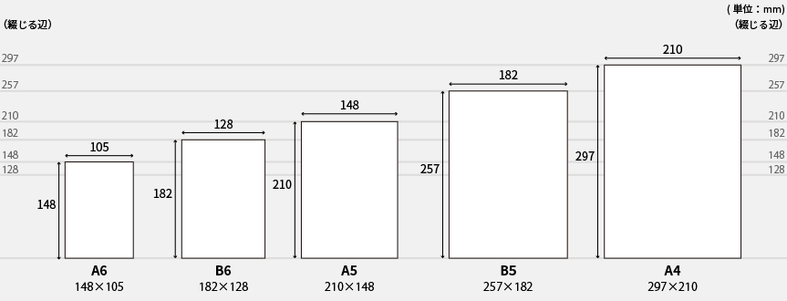 サイズはA6、A5、A4、B6、B5の5種類。幅広いサイズに対応しています。仕上がりサイズとページ数により料金が異なりますので用途に合わせてお選びください。