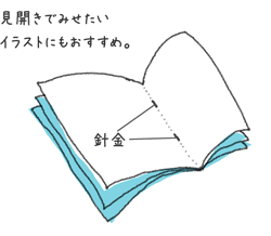 中綴じ製本とは、用紙を重ねて針金でとめる製本方法。