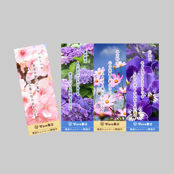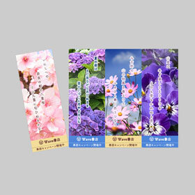 しおり1枚ずつを別々のデザインにすることが可能です。しおりの周囲には広告やロゴ等を入れるスペースを設けているため、販促グッズ、ノベルティに適しています。