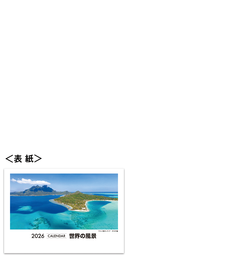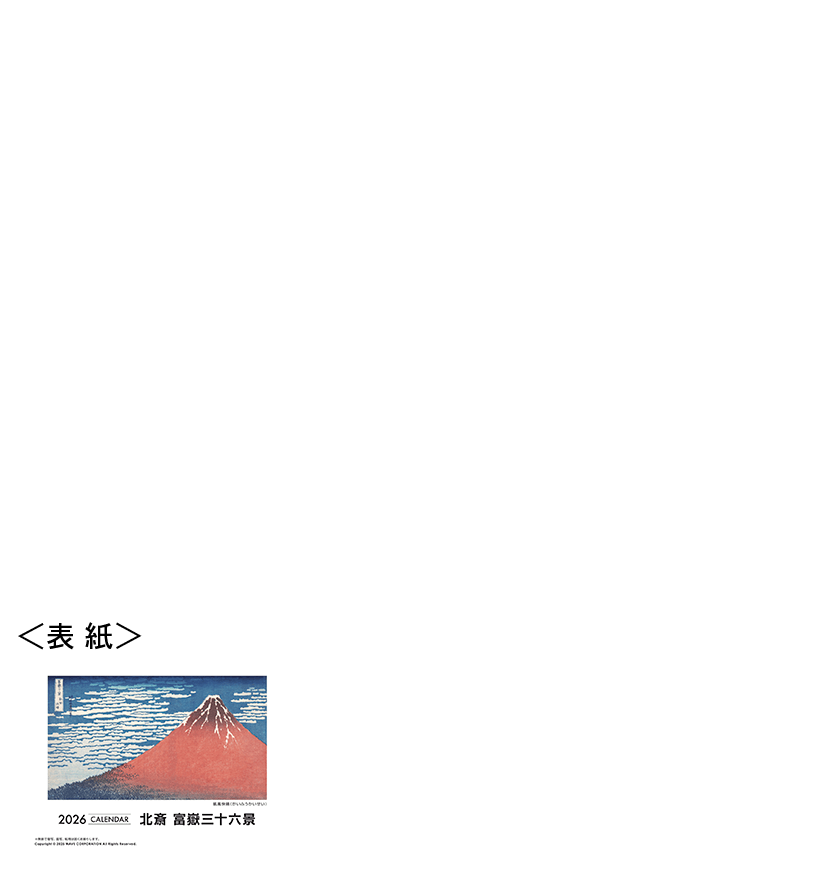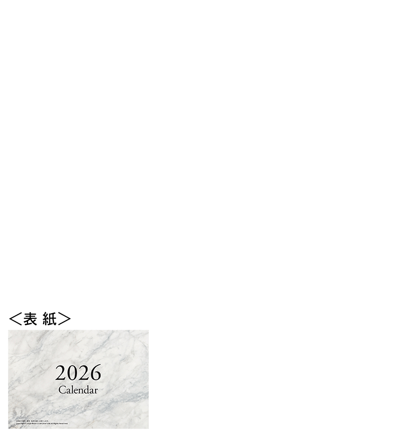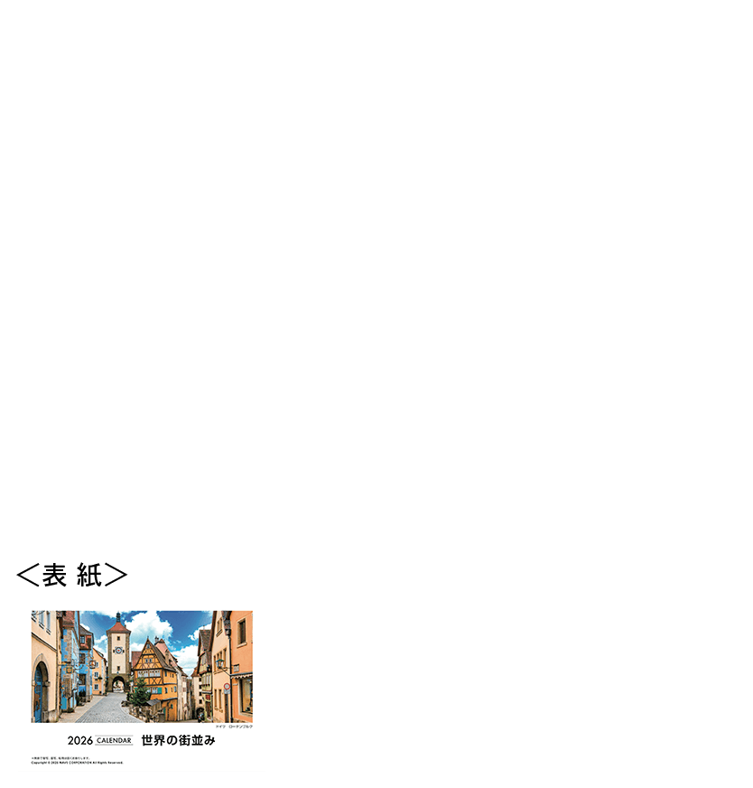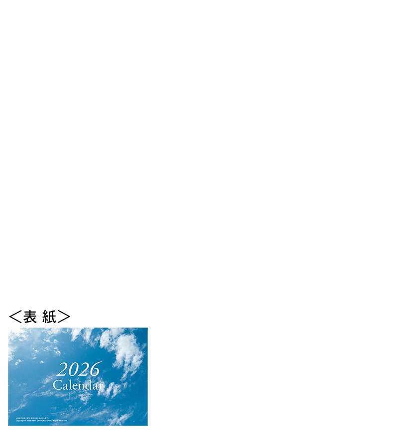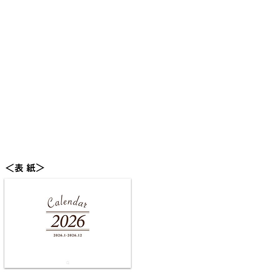 デザインは21種類:「世界の風景」、「富士の四季 十二選」、「フラワー」、「四季の風景」、「世界の街並み」、「北斎 富嶽三十六景」、「猫」、「季節のイベント」、「世界の名画」、「Marine Blue」、「Animal calendar」、「日本の美しい風景」、「ウッド調カレンダー」、「【選べる表紙】ビジネスカレンダー カラーver.」、「【選べる表紙】ビジネスカレンダー クリームver.」、「【選べる表紙】ビジネスカレンダー パステルver.」、「【選べる表紙】筆記体」、「【選べる表紙】書くところが大きい」、「【選べる表紙】メモ欄付き」、「【選べる表紙】日付が大きい」、「【選べる表紙】イタリック」