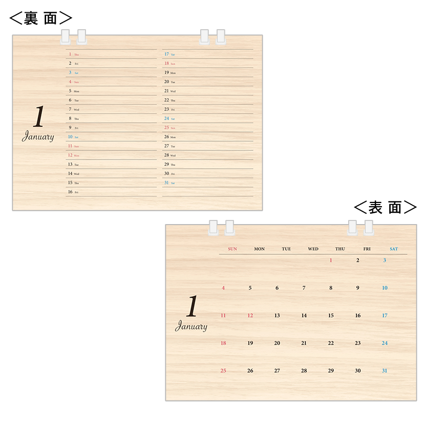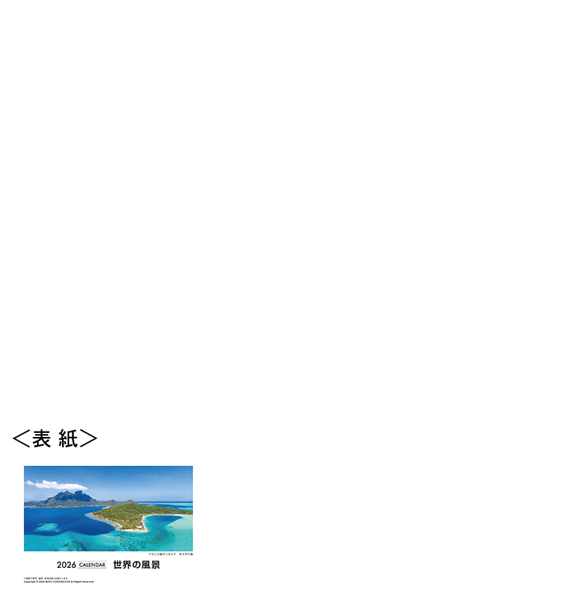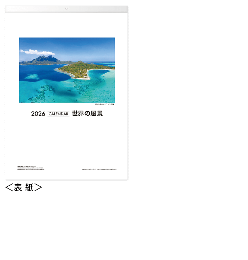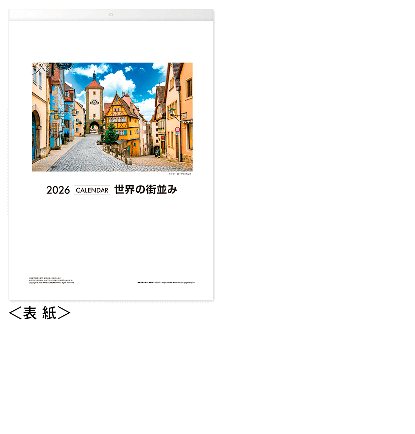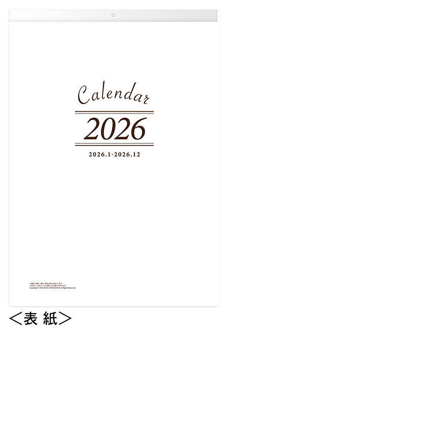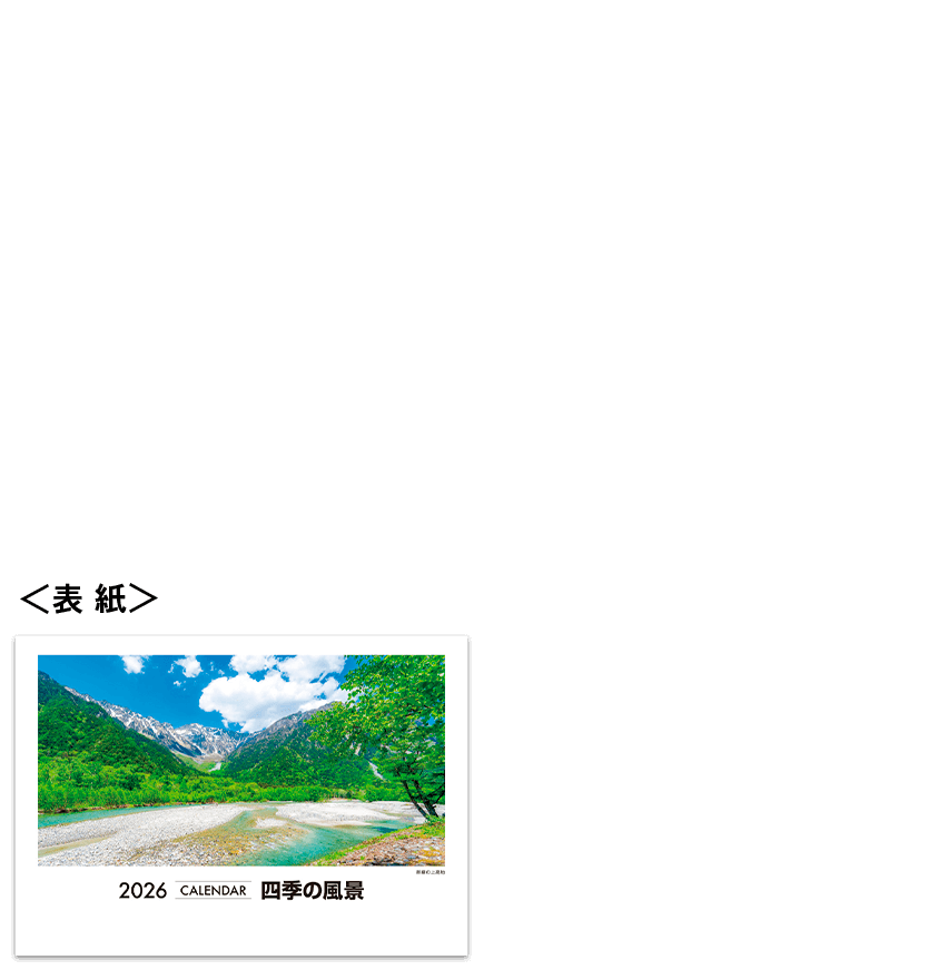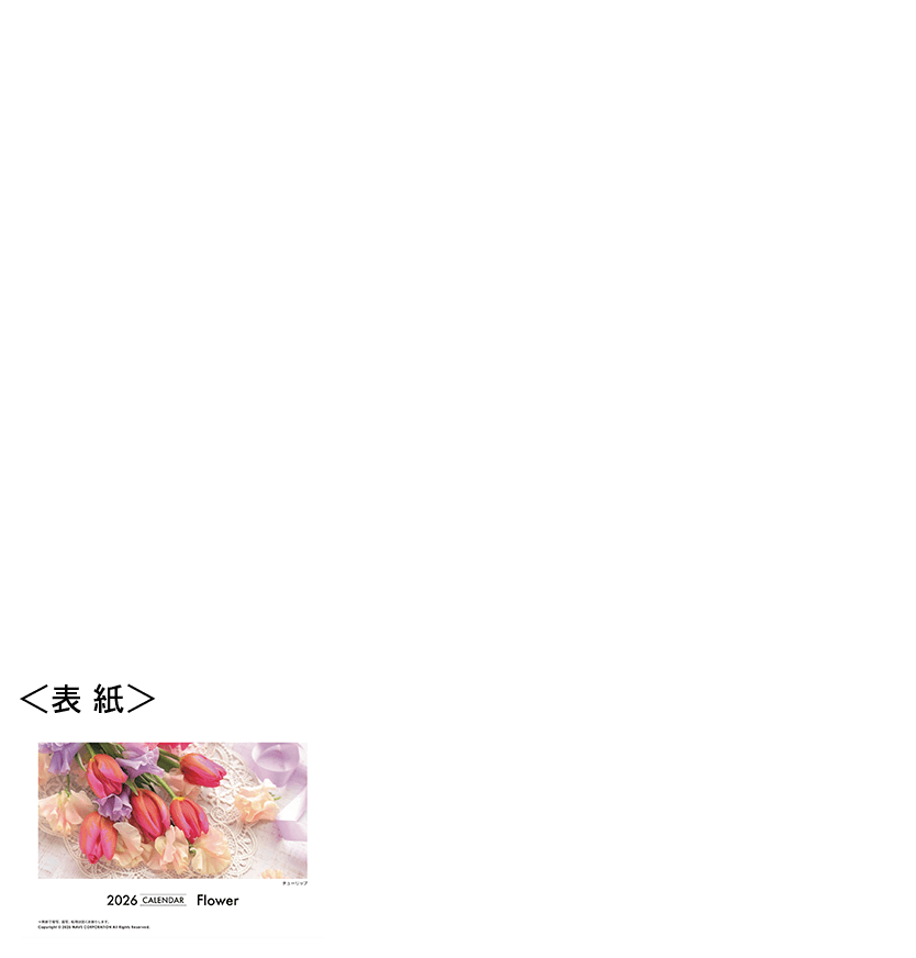 デザインは21種類:「世界の風景」、「富士の四季 十二選」、「フラワー」、「四季の風景」、「世界の街並み」、「北斎 富嶽三十六景」、「猫」、「季節のイベント」、「世界の名画」、「Marine Blue」、「Animal calendar」、「日本の美しい風景」、「ウッド調カレンダー」、「【選べる表紙】ビジネスカレンダー カラーver.」、「【選べる表紙】ビジネスカレンダー クリームver.」、「【選べる表紙】ビジネスカレンダー パステルver.」、「【選べる表紙】筆記体」、「【選べる表紙】書くところが大きい」、「【選べる表紙】メモ欄付き」、「【選べる表紙】日付が大きい」、「【選べる表紙】イタリック」