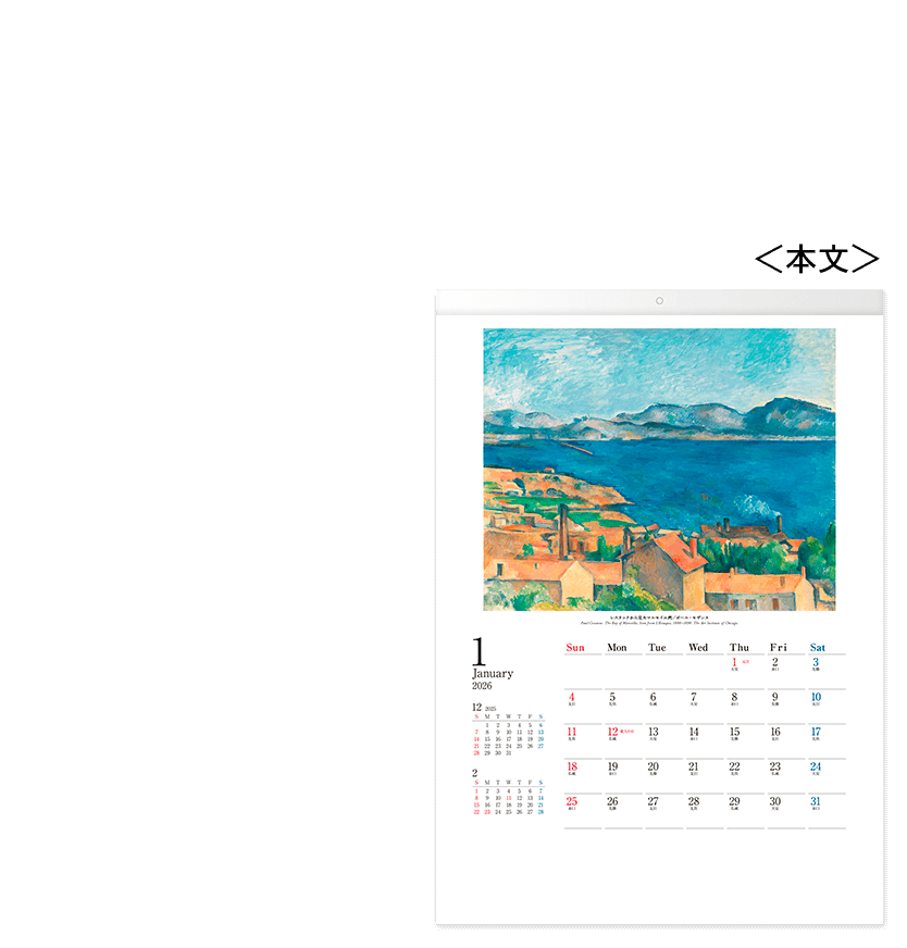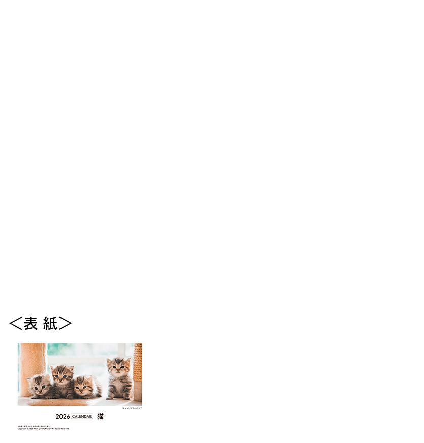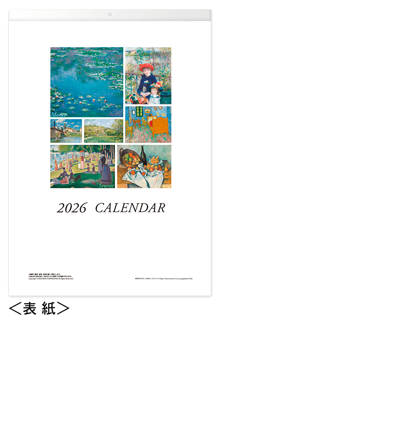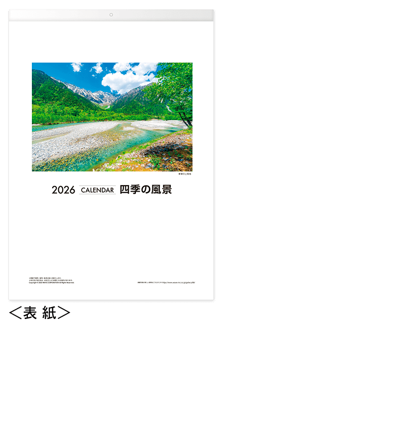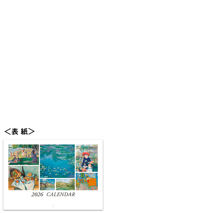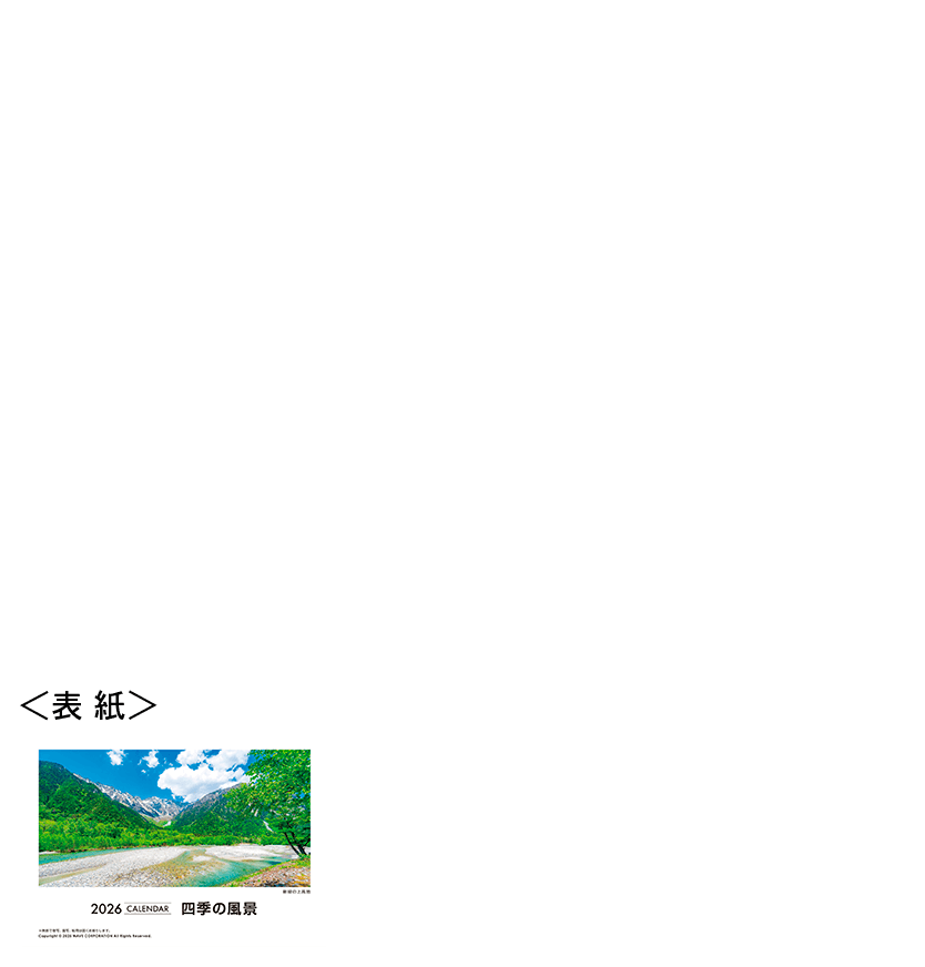 デザインは21種類:「世界の風景」、「富士の四季 十二選」、「フラワー」、「四季の風景」、「世界の街並み」、「北斎 富嶽三十六景」、「猫」、「季節のイベント」、「世界の名画」、「Marine Blue」、「Animal calendar」、「日本の美しい風景」、「ウッド調カレンダー」、「【選べる表紙】ビジネスカレンダー カラーver.」、「【選べる表紙】ビジネスカレンダー クリームver.」、「【選べる表紙】ビジネスカレンダー パステルver.」、「【選べる表紙】筆記体」、「【選べる表紙】書くところが大きい」、「【選べる表紙】メモ欄付き」、「【選べる表紙】日付が大きい」、「【選べる表紙】イタリック」