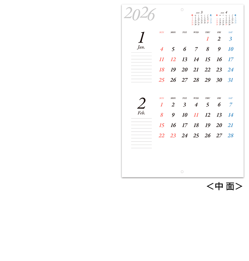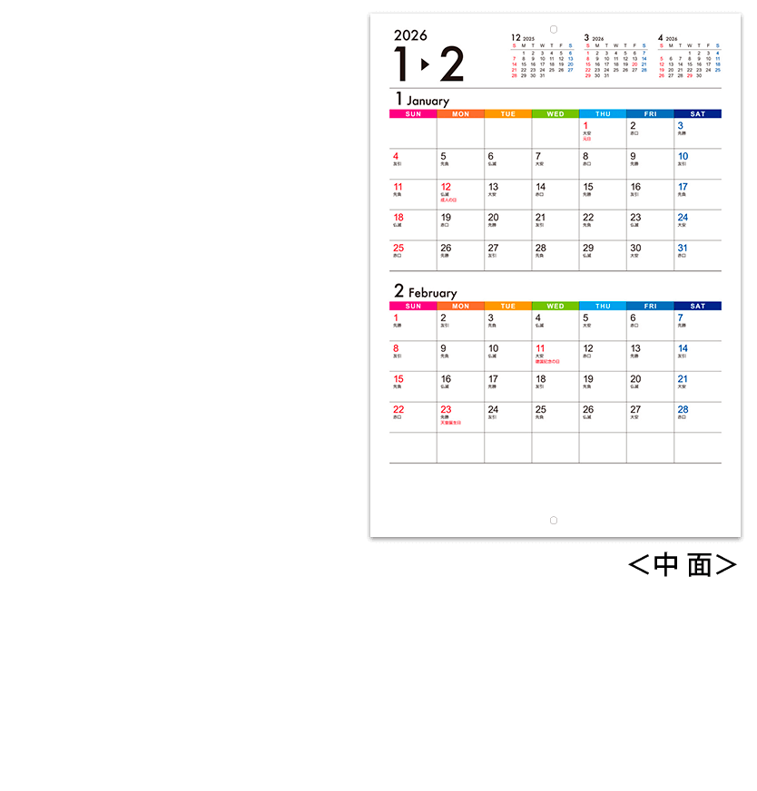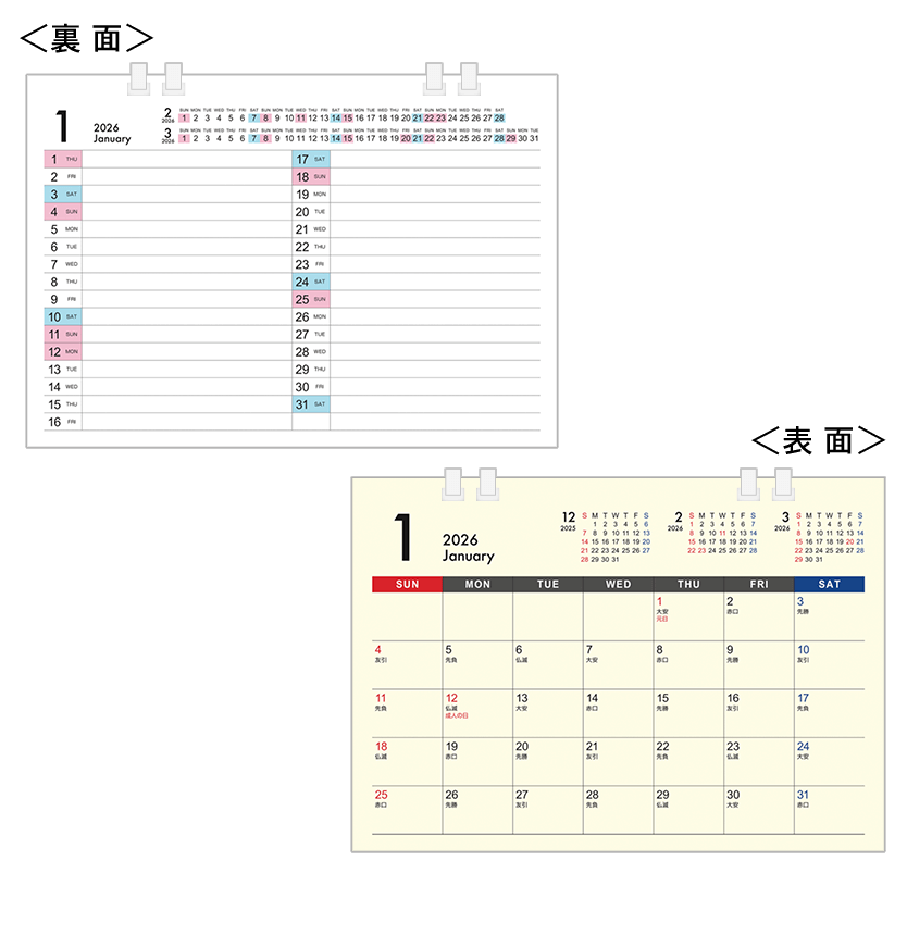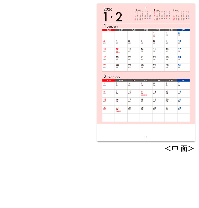 「卓上ECOリング綴じカレンダー」には日付部分に記念日を追加するオプションもございます。また、「ECO壁掛けカレンダー」と「中綴じ冊子カレンダー」では紙種を選ぶことも可能です。さらに、全ての名入れカレンダーで、始まり曜日を月曜または日曜から選べ、個包装にも対応しております。